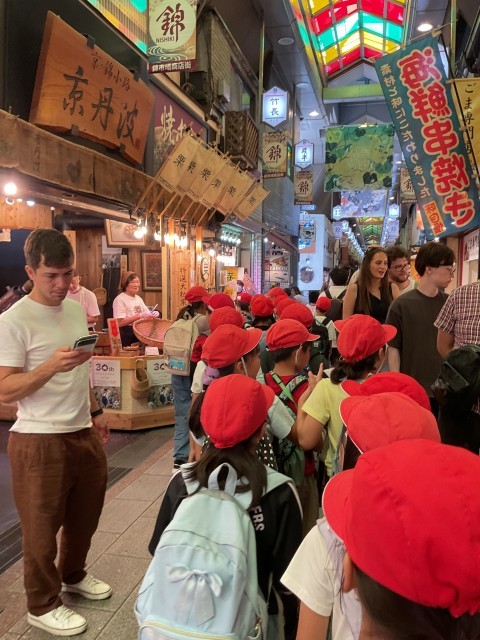 お昼からは、錦市場まで歩きました。みんなの団結力が素晴らしく、横断歩道は途切れることなく渡り切ることが出ました。また、地元の方も観光の方も暖かく、進んで道を譲ってくださりました。
