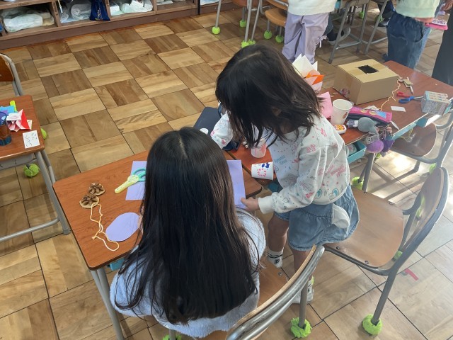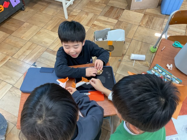 子どもたちは、「保育園の子たちがびっくりするようなものを作りたい!」「これなら楽しく遊んでくれるかな?」と、相手のことを一生懸命に考えながら作業に励んでいます。