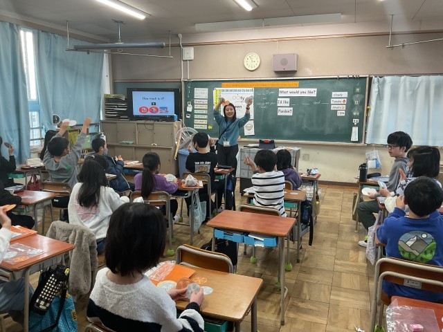 楽しみながら英語特有の表現や数字の言い方に親しみ、教室は活気あるレストランのようでした。
