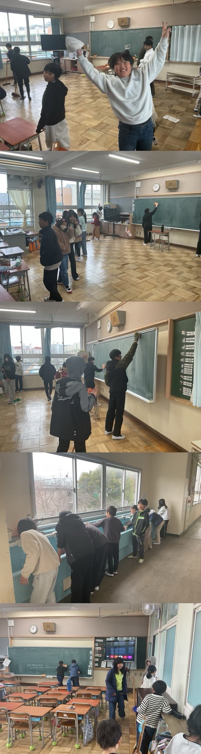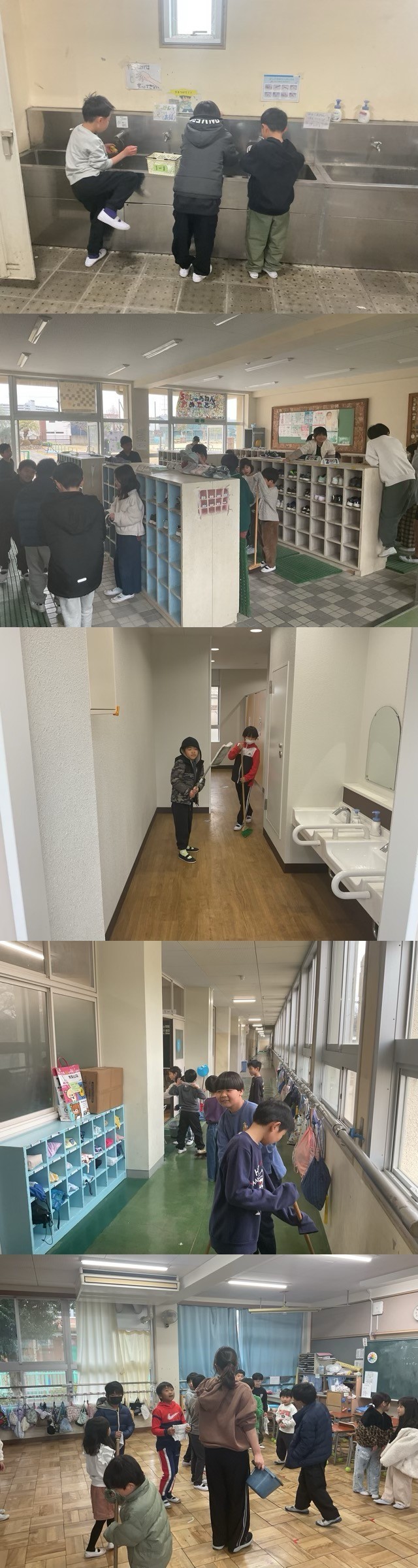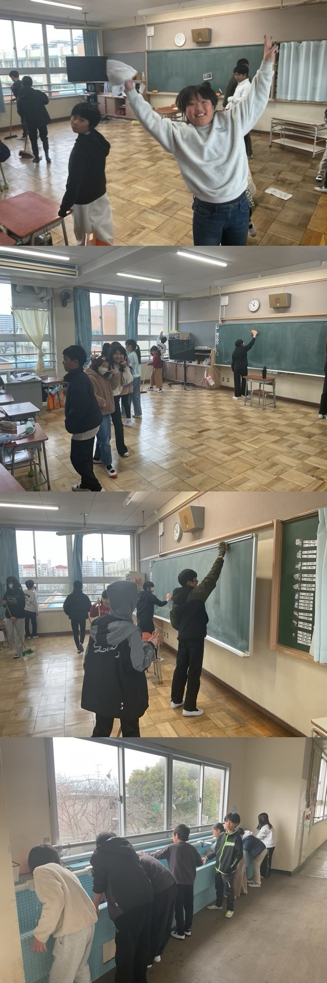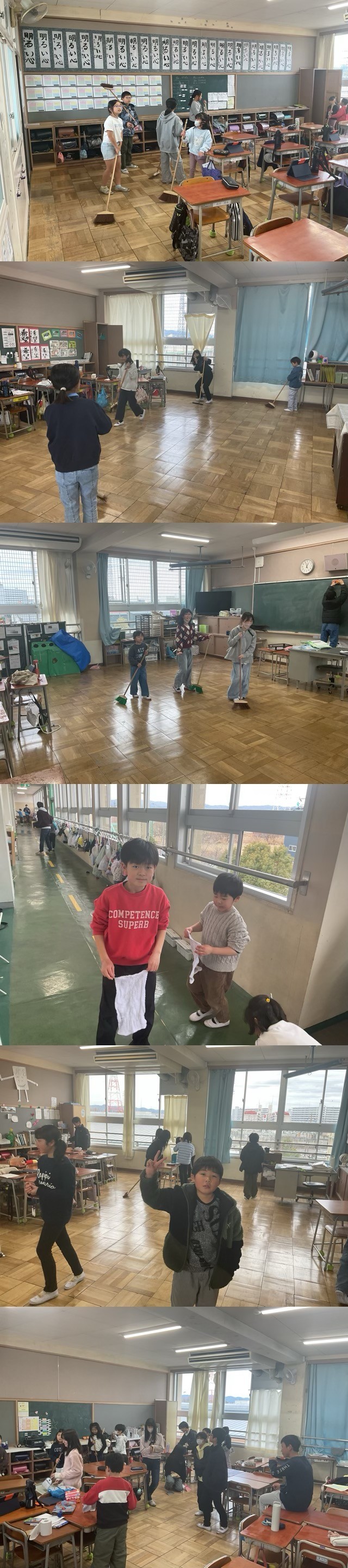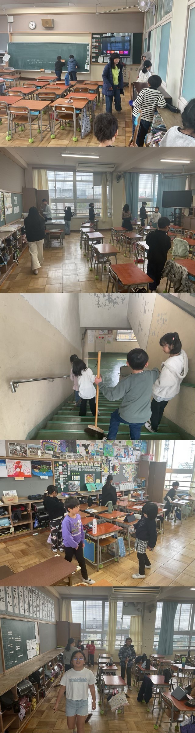 初日の今日は、役割分担や掃除の手順を確認するところからのスタートです。これまで経験のある上級生が、初めて参加する下級生に対し、雑巾の絞り方やほうきの使い方を優しく丁寧に教えている姿が校内のあちこちで見られました。