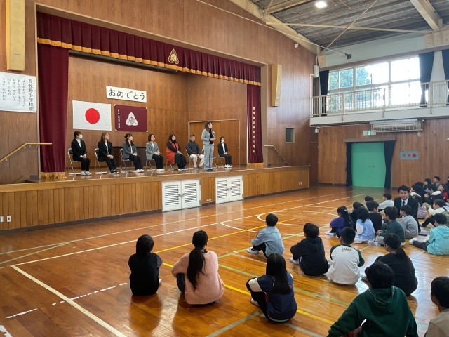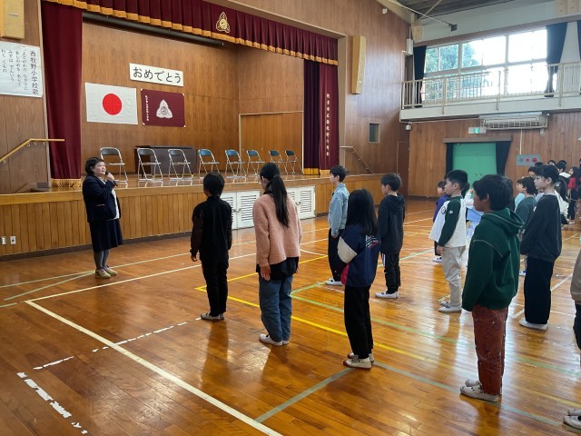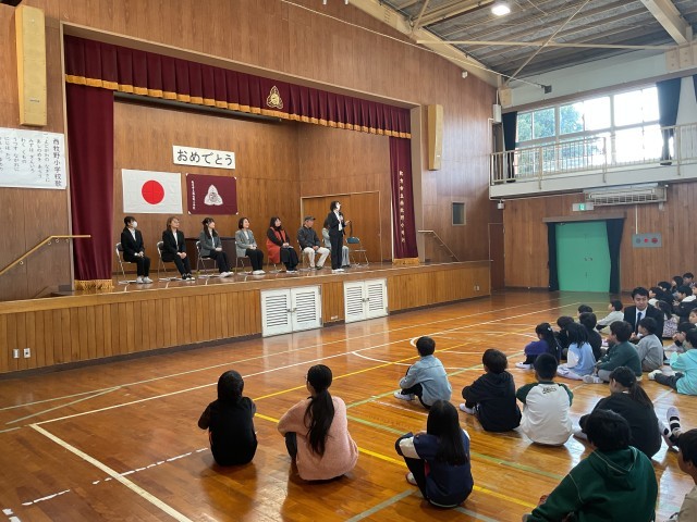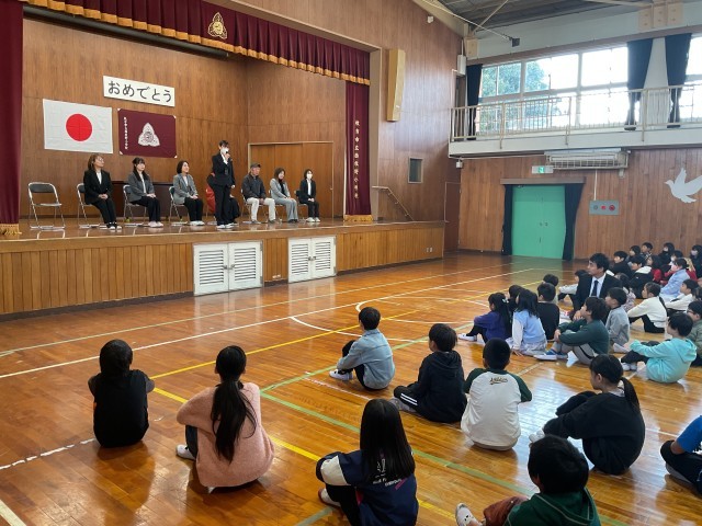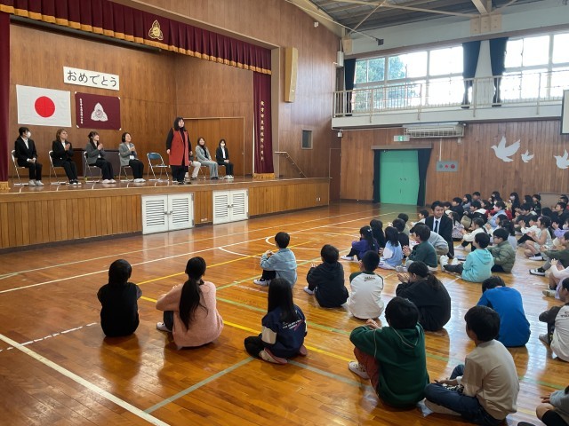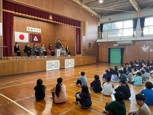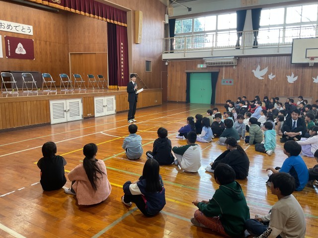 1年間の締めくくりとなるこの日、子どもたちは学習の成果を振り返るとともに、読書活動に励んだ児童への表彰や、学校を去る教職員との別れを惜しむ離任式に臨みました。