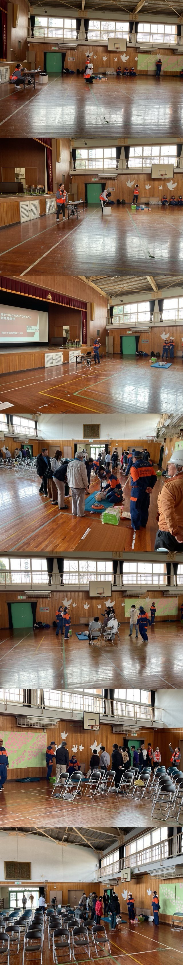• AED(自動体外式除細動器)講習 「もしも」の時に勇気を持って行動できるよう、大人も子どもも真剣な表情で操作手順を学びました。