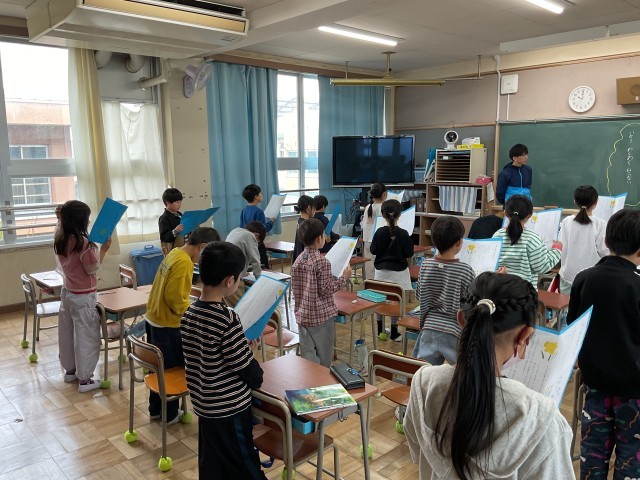 今日の国語の時間は、物語「すいせんのラッパ」の音読練習を行いました。