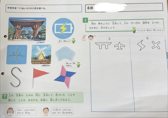 授業の冒頭、子供たちの手元に配られたのは、金沢駅の「鼓門」、飛行機、風車、そしておなじみのマークが並んだワークシートです。