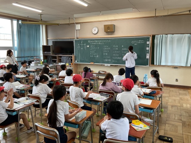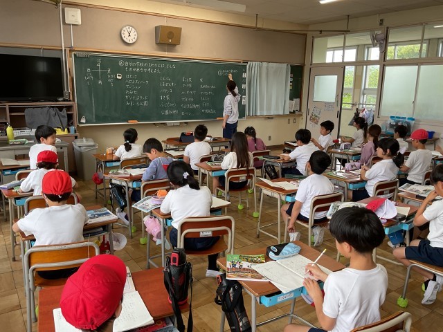 授業ではまず、東西南北の「方位(ほうい)」を確認。その後、みんなが知っている場所を次々に発表しました。