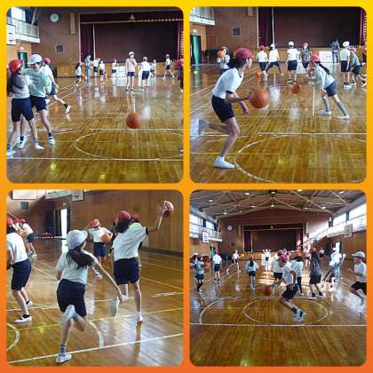 ドリブルの練習です。ドリブルをしながら鬼(白帽子)がら逃げます。
