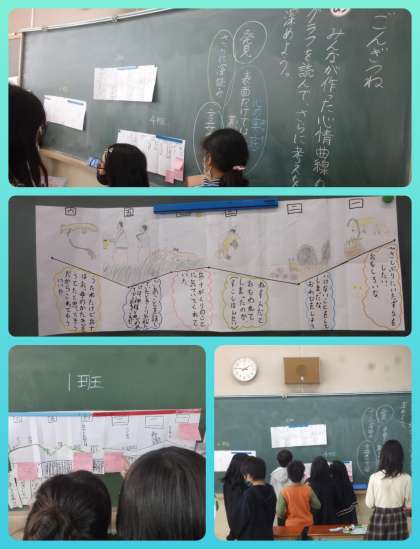 「ごんぎつね」の学習です。 各班が作った主人公「ごん」の心情曲線を確認し合っています。