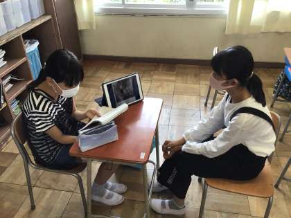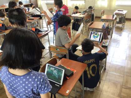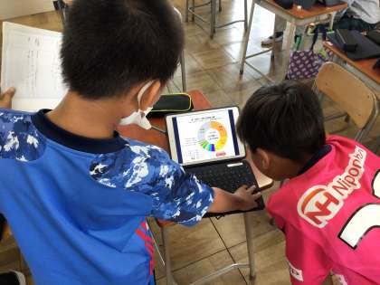 環境問題について調べ、調べたことをみんなでプレゼン発表しています。自分が興味のある問題について本やインターネットを使い調べまとめたことを、タブレットを使いプレゼン発表しています。プレゼン発表は2回目なので少しずつ慣れてきました。今日は、お家でも発表会を開きます。