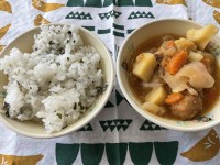 今日の献立はパーカーパン、牛乳、いんげんまめのクリームスープ、なすのカレーサンド、キャベツソテーでした。