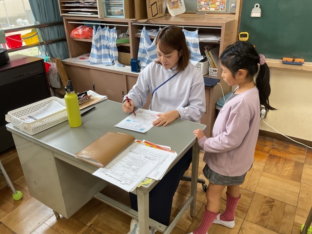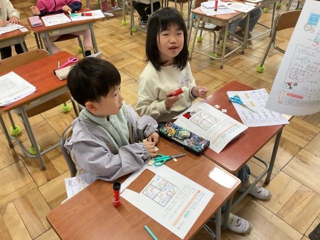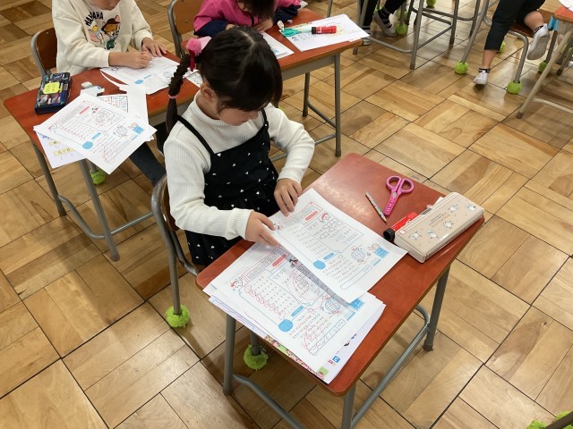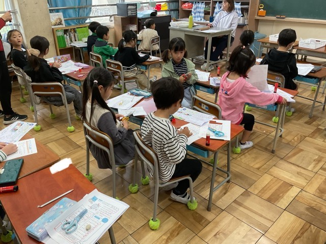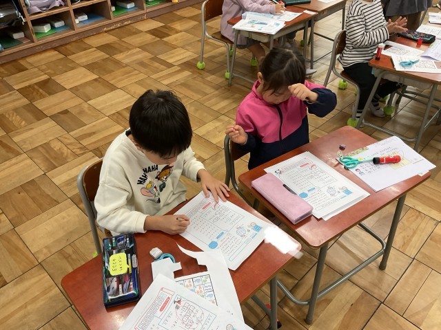 1年生にとって漢字学習は、好奇心を刺激する楽しい活動を通して行われ、鉛筆の持ち方や正しい書き順にも気を配りながら、一画一画丁寧に文字を形にしていました。