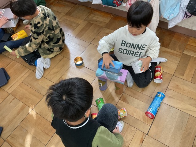 子どもたちは自分の作品をとても誇らしげにしており、「次はもっと大きな箱で作りたい!」「今度は乗り物を作る!」と、早くも次の制作活動に意欲を見せていました。