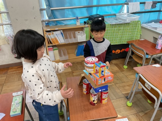 高層タワー:積み重ねる楽しさを感じたのはタワーや建物の制作です。不安定にならないよう、土台をしっかりと固定する工夫を凝らし、自分たちの背丈よりも高いタワーに挑戦する子もいました。完成した作品を並べると、まるで小さな街のジオラマのようでした。