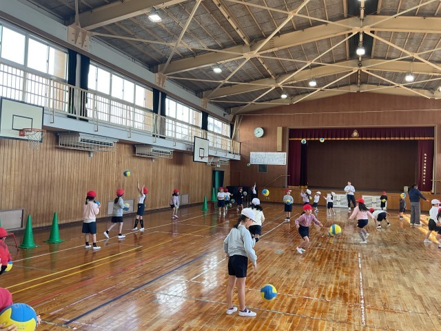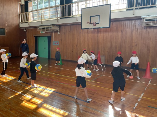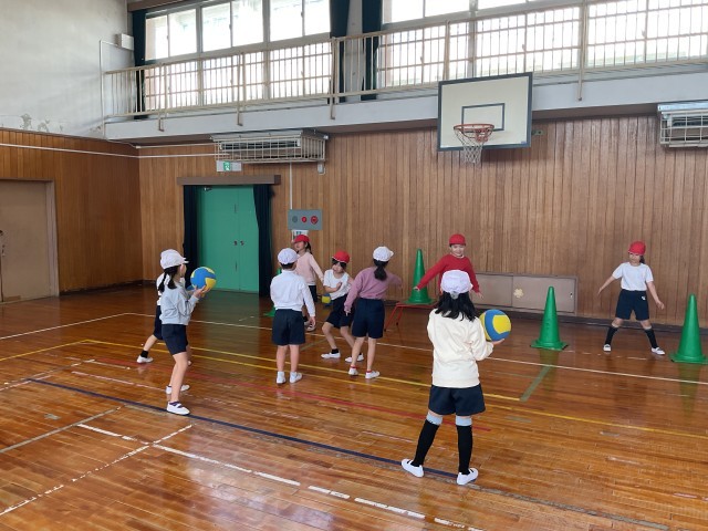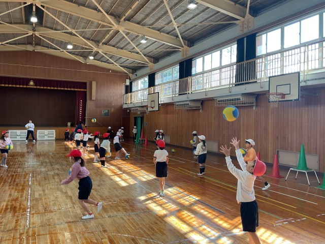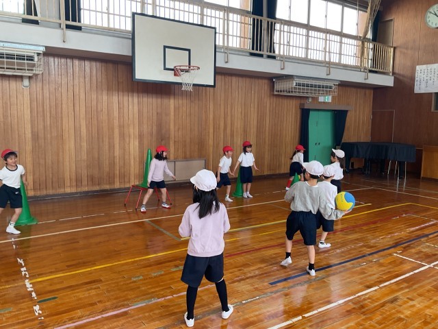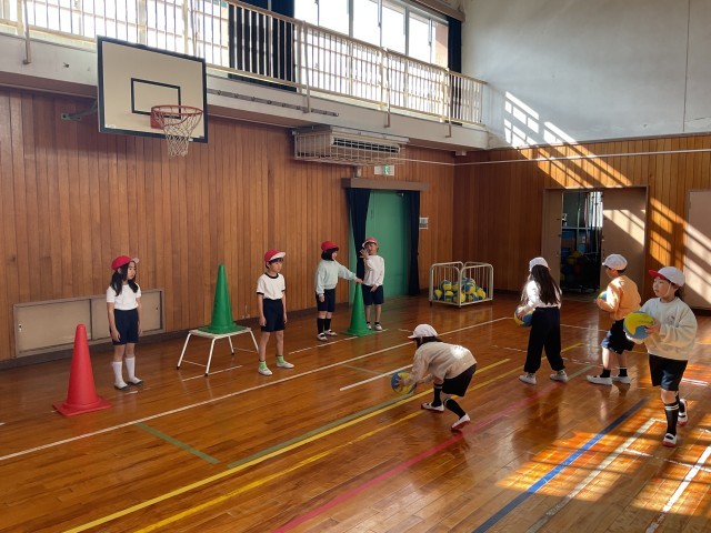 体育の授業では、元気いっぱいに「的当てゲーム」を行いました。