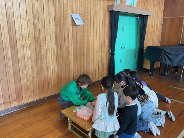 探検でお腹が空いた後は、お待ちかねの給食タイムです。今回は体育館にシートと机を広げ、ピクニック気分で一緒に食事を楽しみました。