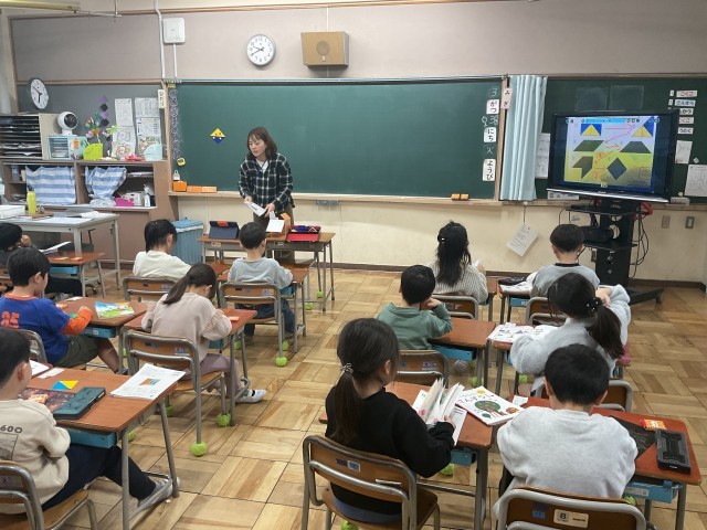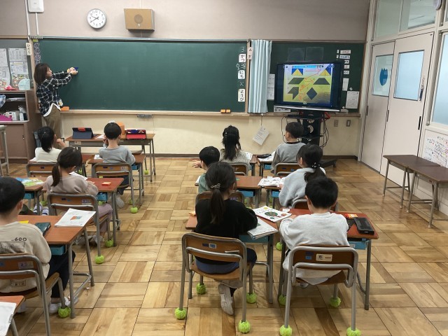 今日の算数の時間は、みんなが楽しみにしていた「かたちづくり」の学習を行いました。 使うのは、色とりどりの三角形や四角形の「色板(いろいた)」です。