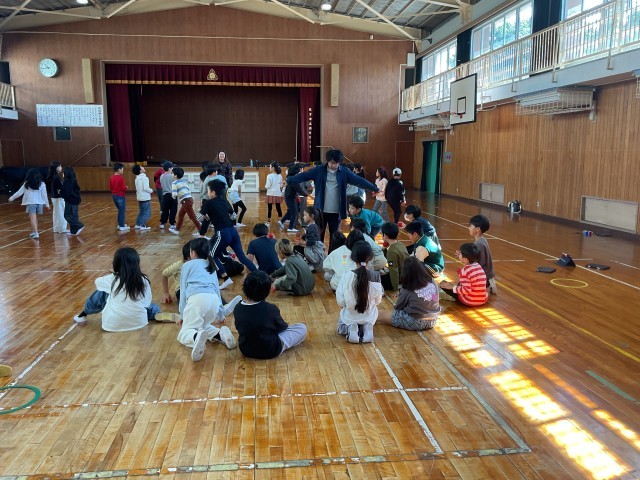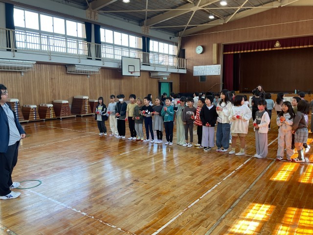 算数「丸い形を調べよう」の学習として、体育館で特別な授業に臨みました。単なる座学ではなく、体全体を使って丸い形(円)の性質を考える、活動的な時間となりました。