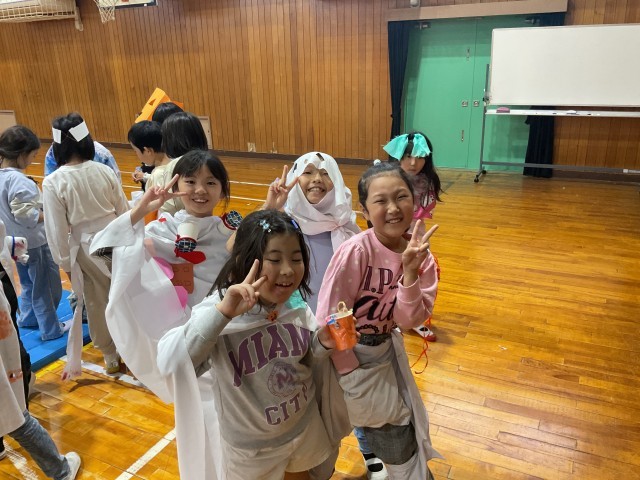 ❓頭と体を使う「クイズ大会」仮装で盛り上がった後は、今回のメインイベント「クイズ大会」に挑戦! 🍬最高の笑顔でフィナーレ たくさんのクイズに挑戦し、思いっきり仮装を楽しんだ3年生たち。最後は、大満足の笑顔でパーティーは終了しました。 「来年はもっとすごい仮装にする!」「クイズの勉強をしておく!」と、早くも来年のハロウィンに期待を膨らませる声が聞こえてきました。 今年のパーティーは、仮装の楽しさ、クイズに挑戦する真剣さ、そして友達と協力する喜びをたっぷり感じられる、思い出に残る楽しい時間となりました。 +3