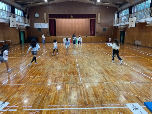 3年生 🕺今日のミッション:色と形で仲間を探せ!3年生の外国語活動で、図形(Shapes)と色(Colors)をテーマにしたアクティビティ、その名も「シェイプバスケット」を行いました! 「フルーツバスケット」の外国語版…と思いきや、今回は英語で呼ばれた「色」と「形」をどちらも持っている仲間を探して、急いで集まるという、スピードと集中力が試されるゲームです。 🚨教室に響く先生のコール!先生が「Red Circle! (赤い丸!)」とコールすると、子どもたちは持っているカードを見て、一斉に立ち上がります。 「あった!」「僕も!」「あっちにもいる!」 自分のカードが「Red Circle」だった子は、席を立って「Circle!」のジェスチャーをしながら素早く集まります。間違えて立ち上がってしまった子は、ちょっぴり照れ笑い。 「Yellow Triangle! (黄色い三角!)」のコールでは、教室のあちこちで「Triangle!」と三角を手で作るジェスチャーが飛び交い、瞬く間に集合場所へ! 🏃♂️まるで運動会!?このゲーム、単語を聞き取るだけじゃなく、「素早く仲間を見つける動体視力」と「猛ダッシュする脚力」も必要不可欠。まるで教室が運動会か鬼ごっこのような熱気に包まれました! 中には、Green Square(緑の四角)の仲間を探して、教室の端から端まで全力で走り抜ける、アスリート顔負けの子も!🏃♀️💨 💡笑いと学びが詰まった時間ゲームを通して、子どもたちは楽しみながら自然と以下のことを身につけました。 - 色の単語 (Colors): Red, Blue, Yellow, Green...