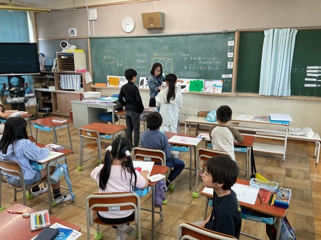 図工の授業で、色鉛筆とクレヨンを使い、自分たちの好きなものを自由に描く活動が行われました。