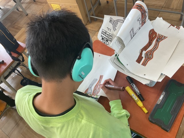 授業では、まず自分のボードに楽しいデザインを描き込みました。宇宙、海、動物など、個性あふれるテーマが飛び出し、制作への期待感が高まります。