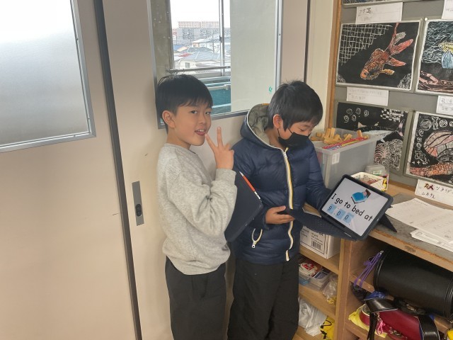 まずは、一番リラックスできる「班の仲間」に向けて発表です。 「Wake up」「Go to bed」などのキーワードを使い、タブレットを見せながら紹介しました。仲間の発表を聞いて「Me too!(同じだ!)」という声が上がるなど、和やかな雰囲気でスタートしました。