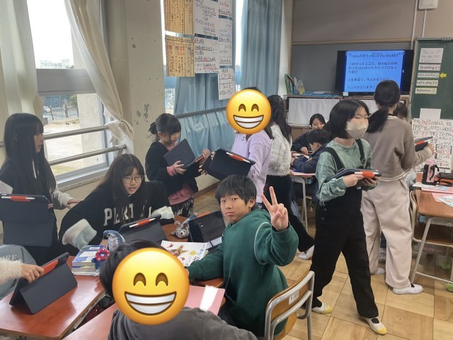 次は、席を移動して「ペア」での紹介です。 班の時よりも少し緊張感が増しますが、その分「相手に伝えよう」という意識が強まります。アイコンタクトを意識したり、聞き手の友達が「Oh! Nice.」とリアクションを返したりと、双方向のコミュニケーションが生まれていました。