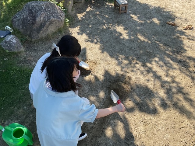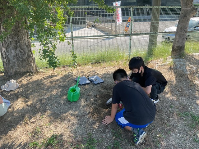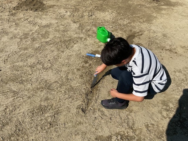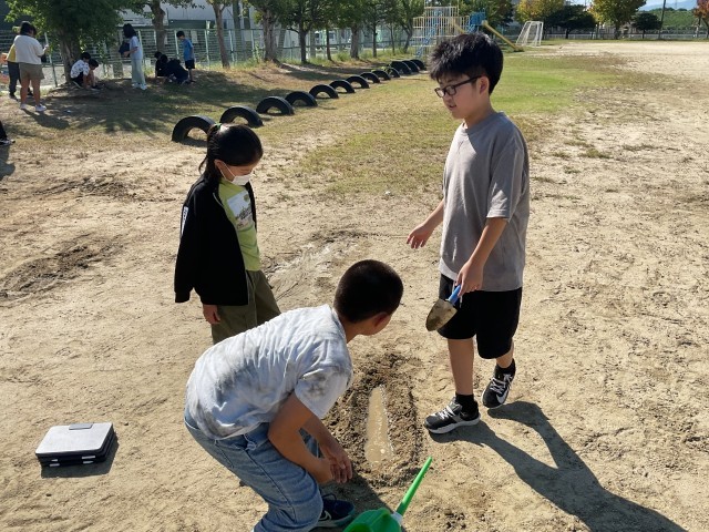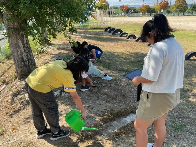 理科の授業で、5年生たちが「流れる水の働きと土地の変化」の学習の一環として、校庭の土を使ってオリジナルの「川」を作る実験に挑戦しました。グループごとにアイデアを出し合い、ジョーロやペットボトルを使って水を流すことで、本物の川で起こる現象を間近で観察しました。