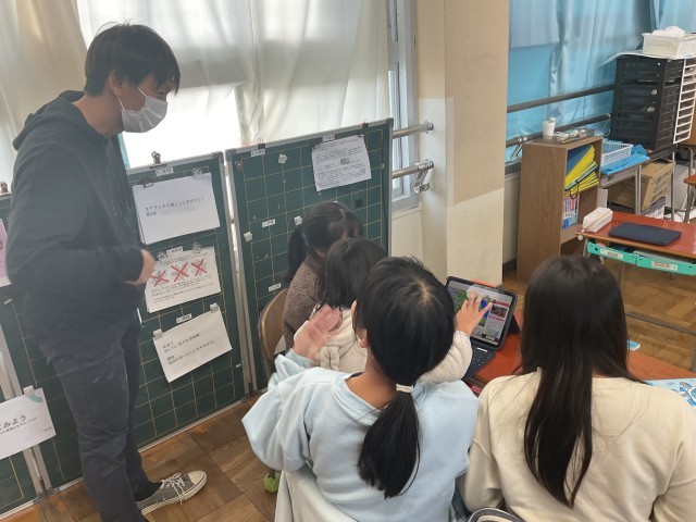 5年生の教室では、児童たちが一人一台のタブレット(iPadなど)を操作し、目を輝かせながらゲーム画面と向き合っていました。