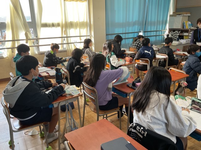 子どもたちは、「You can see Mt. Fuji.」「You can eat Sushi.」といった具体的な魅力を、工夫を凝らした表現で紹介し、外国からのお客様を惹きつける熱意あふれるPR文を完成させました。