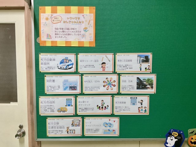 校長室前の掲示板に、生活面を担当している武藤先生が、今年度川越小学校に来てくださった「いろいろなおしごとの人たち」をまとめて掲示してくれています。