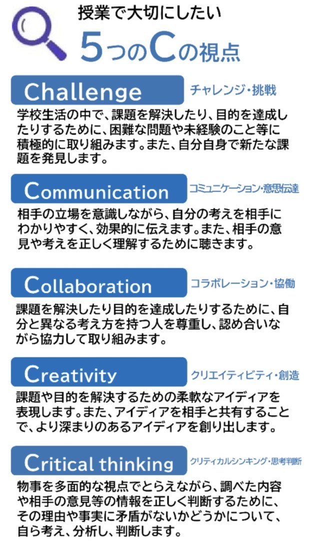 枚方市では、このような非認知能力を育成するために、「5C(チャレンジ/Challenge・コミュニケーション/Communication・コラボレーション/Collaboration・クリエイティビティ/Creativity・クリティカルシンキング/Critical Thinking)」という視点を教育活動に取り入れています。枚方市教育委員会では、「未来を生きる子どもたちにとって必要な資質・能力を育む」ために、この5つのCを頭文字としてまとめ、それぞれが非認知能力に深く関わるものと位置づけています。