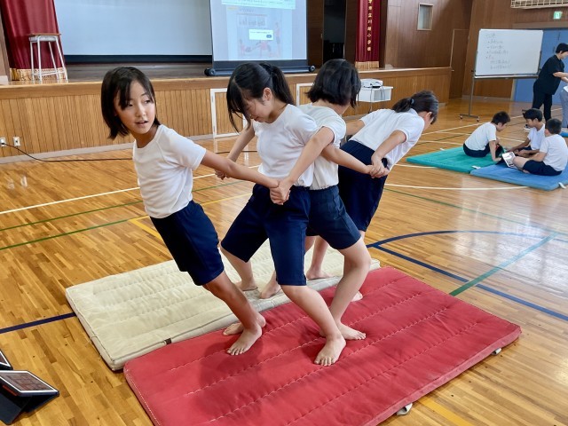 5・6年生は、運動会に向けて「三人技」「四人技」の練習を始めました。