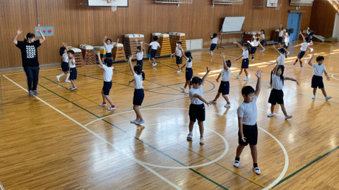 体育館に元気な音楽が流れると、1・2年生の子どもたちが笑顔で踊りはじめました!