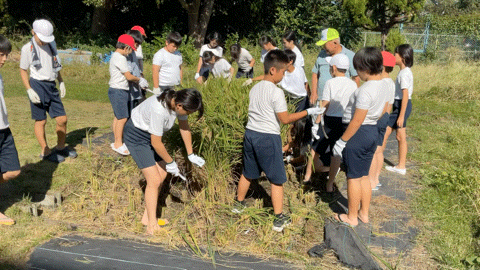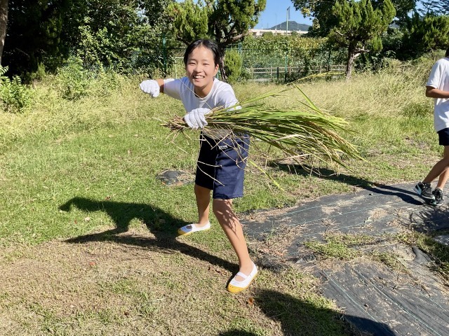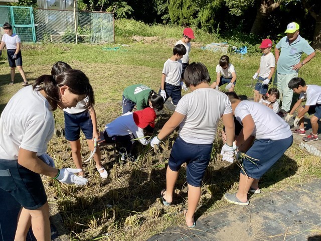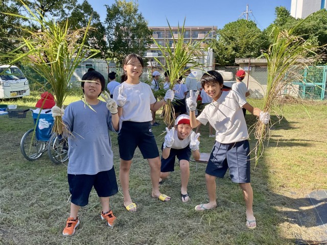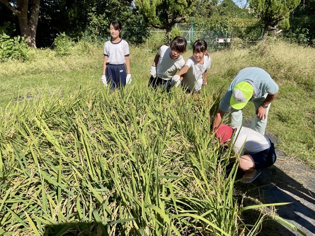 秋の陽ざしの下、5年生が校内で育ててきた稲の刈り取りを行いました。