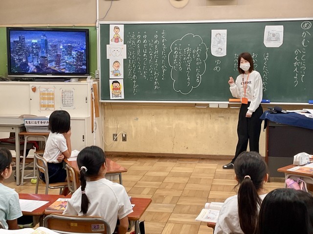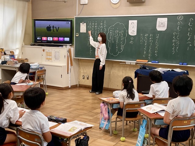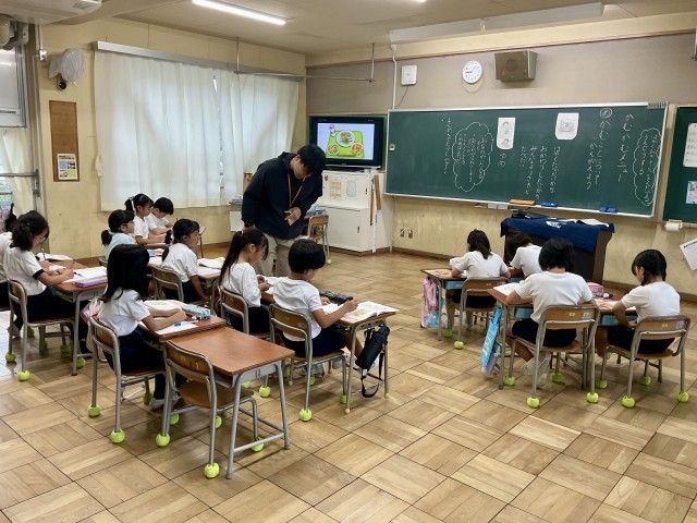 授業の後半には栄養教諭の河本先生も参加し、「よく噛むことの効果」についてわかりやすく教えてくださいました。