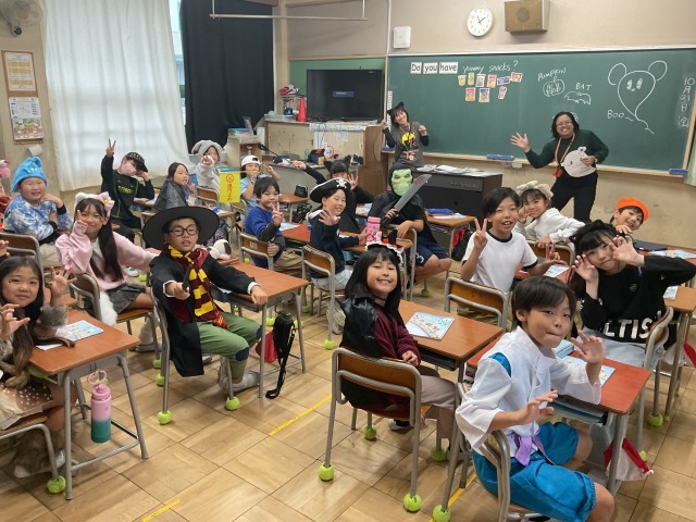先週より3週間川越小学校で勤務されているメイ先生の外国語の授業。今日は4年生の授業でしたが、ハロウィンということで、みんな仮装しての楽しい授業を行なっていました。