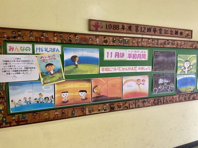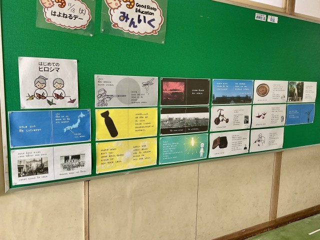 廊下には、平和をテーマにした絵本のページを掲示し、子どもたちが立ち止まって読んだり、友達と感想を語り合ったりする姿が見られます。