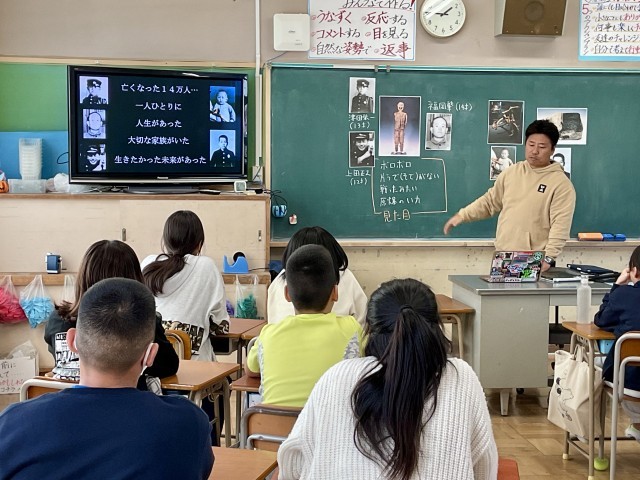 授業では、当時の写真を見ながら、一人一人に「人生があったこと」「大切な家族がいたこと」「生きたかった未来があったこと」に思いを寄せ、子どもたちは真剣な表情で話を聞いていました。