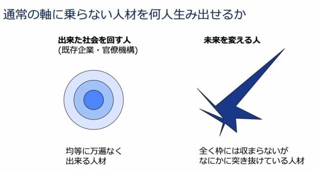 「シン・二ホン」(安宅和人)の中に出てくるイラストで示されているように、既存の社会を安定的に動かしていく「均等にできる人」に加えて、枠には収まらないが、どこか鋭く飛び抜けている「未来を変える人」の両方が求められています。特に後者の力を支えているのは「好き」「夢中」「やってみたい」といった内面から湧き出る思いです。