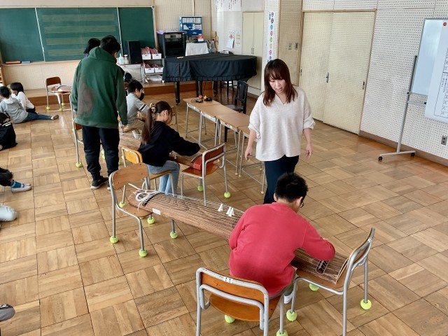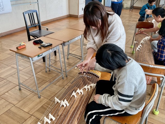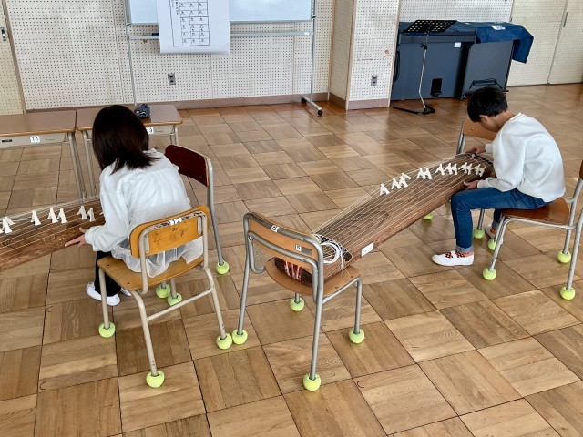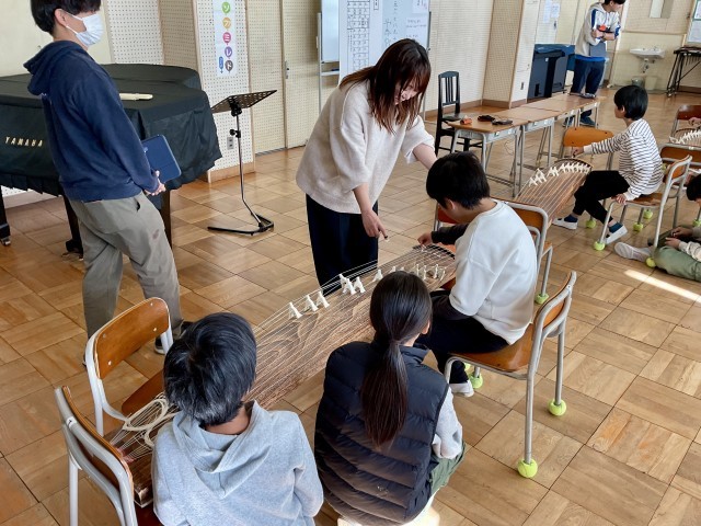初めて触れる子も多い琴。音楽室に響く音色に、子どもたちは少し緊張しながらも、弦をはじくたびに表情が和らいでいく様子が印象的でした。講師の先生からは、演奏するときの姿勢や指の使い方などを、実演を交えながら丁寧に教えていただきました。