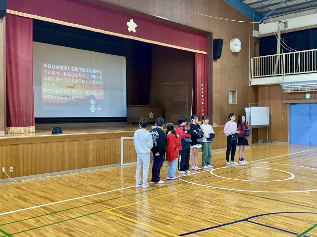 はじめに、児童会の子どもたちから「冬休みに心がけること」についての発表がありました。自分たちの言葉で、生活リズムや安全への意識を呼びかける姿から、日々の学校生活の中で育ってきた主体性を感じました。