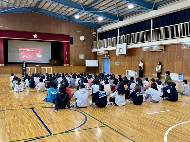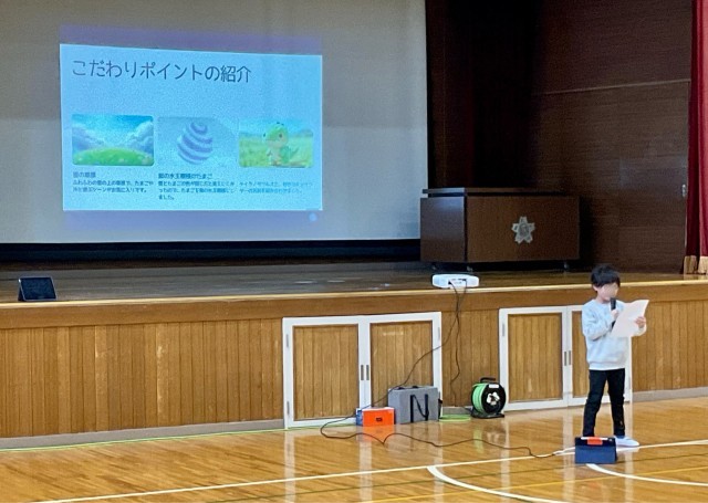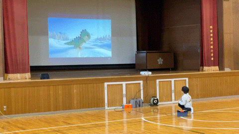 続いて、3年生の児童が生成AIを活用して制作したミュージックビデオを、全校で鑑賞しました。音楽と映像が組み合わさった作品に、体育館からは自然と拍手が起こり、子どもたちの創造力と挑戦する力が伝わってくる時間となりました。