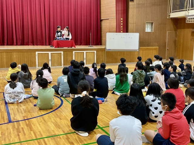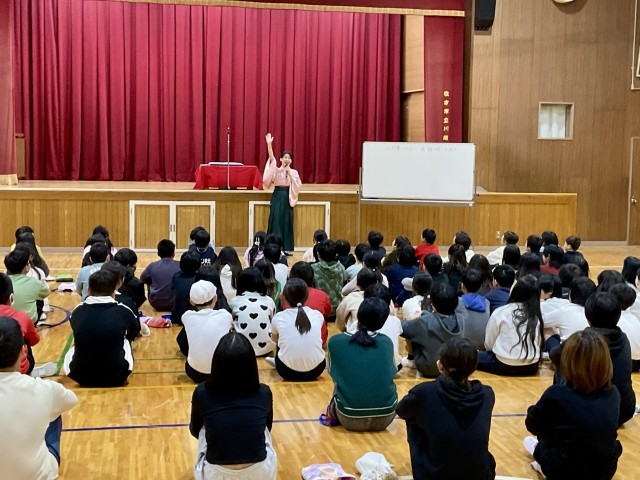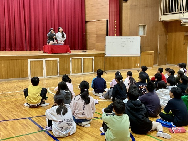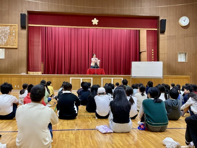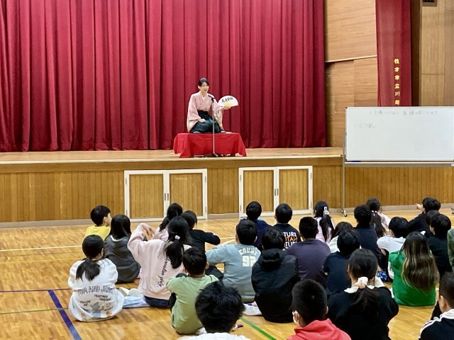 後半は、落語の要素を取り入れた体験活動です。子どもたちはペアになり、言葉だけに頼らず、表情や身振り手振りを使って相手を笑わせることに挑戦しました。そこでは、「どうすれば笑いが生まれるのか」を考えながら工夫する姿や、自然と生まれるあたたかい笑いがあふれていました。