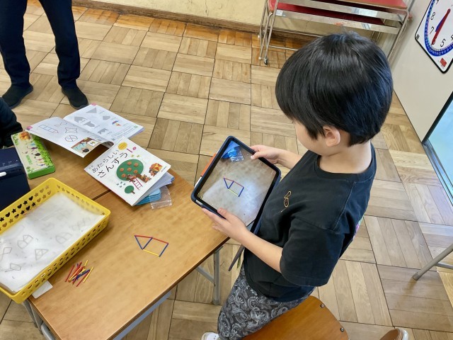 この日の学習は、三角形や四角形などの図形を組み合わせながら、