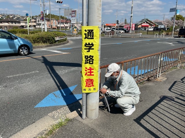 コメダコーヒー横の横断歩道の道幅が狭く、危ないため電柱に「通学注意」の啓発幕を設置しました。