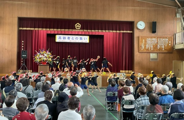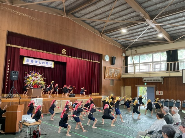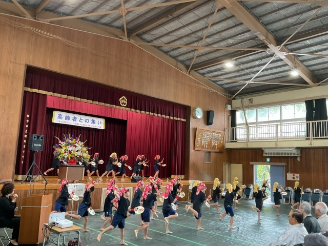 10月26日。日曜日ですが、地域行事「高齢者との集い」において3年生の有志児童が「ダイナミック☆エイサー」を披露しました。