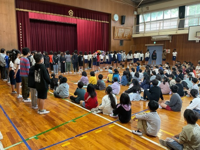 10月28日児童朝会にて。来月修学旅行に行く6年生は他学年から受け取った折り鶴のお礼を伝え、歌を披露してくれました。