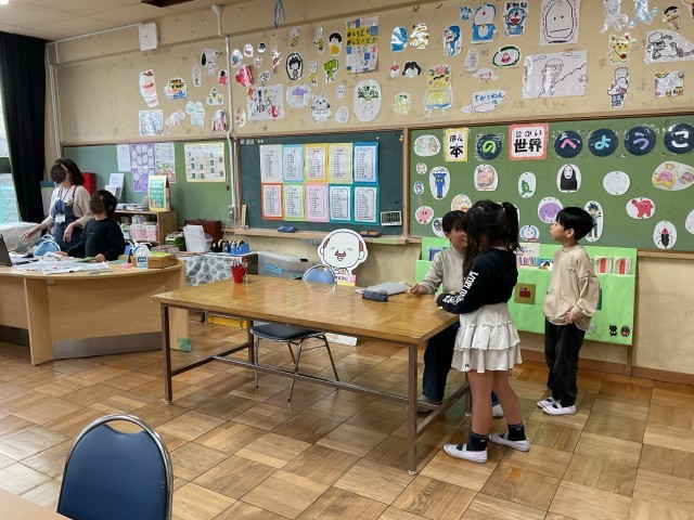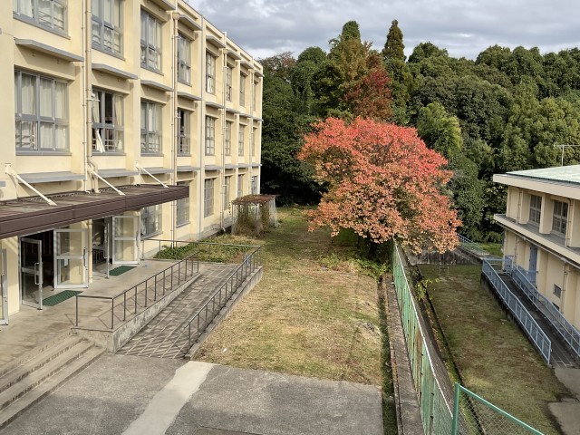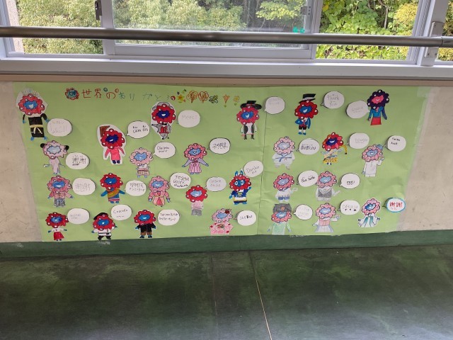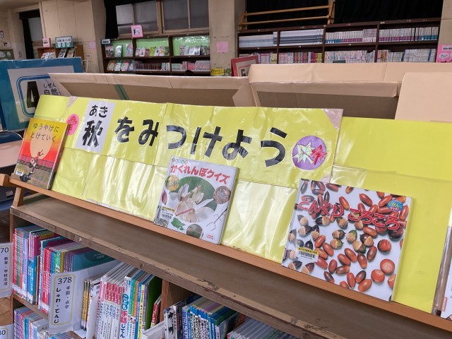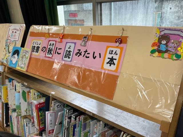 11月4日。図書室には秋をテーマにしたコーナーがあります。学校木々の葉っぱも赤く色づきました。廊下には今でも人気のキャラクターを使って様々な言葉を学ぶ掲示物があります。読書の秋、学びの秋です。