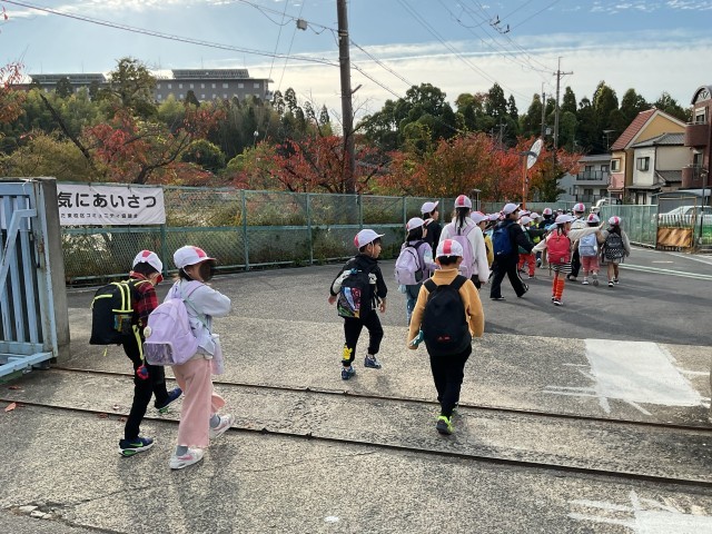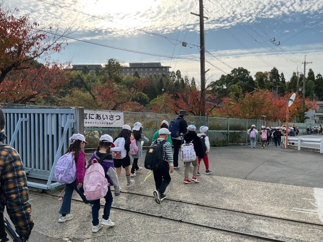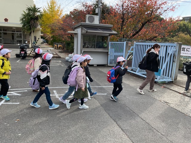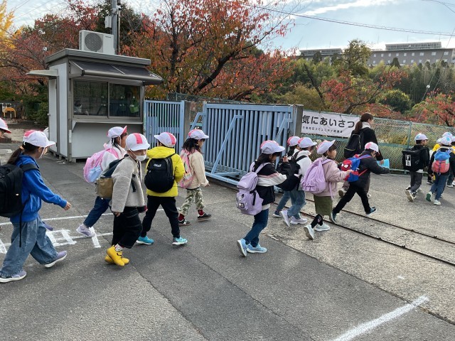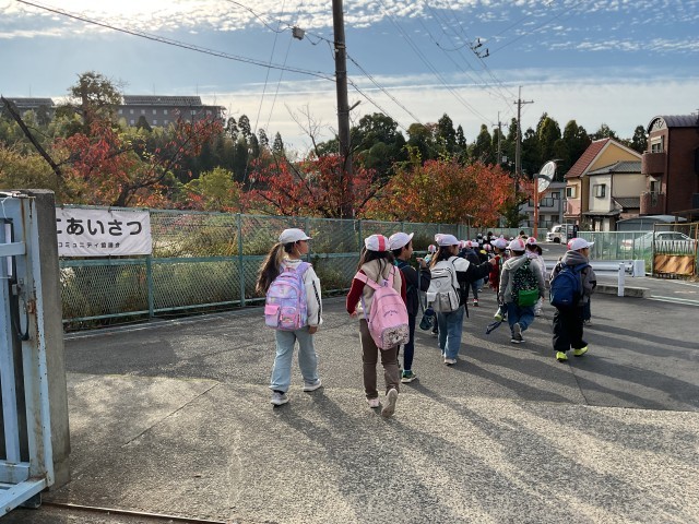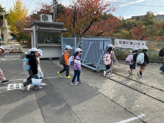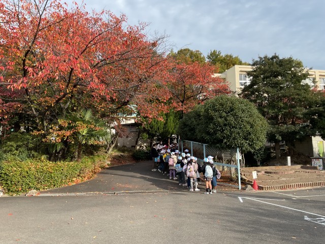 11月18日。深まる秋の風景の中、1年生と2年生は元気よく遠足に出発しました。楽しんできてください。