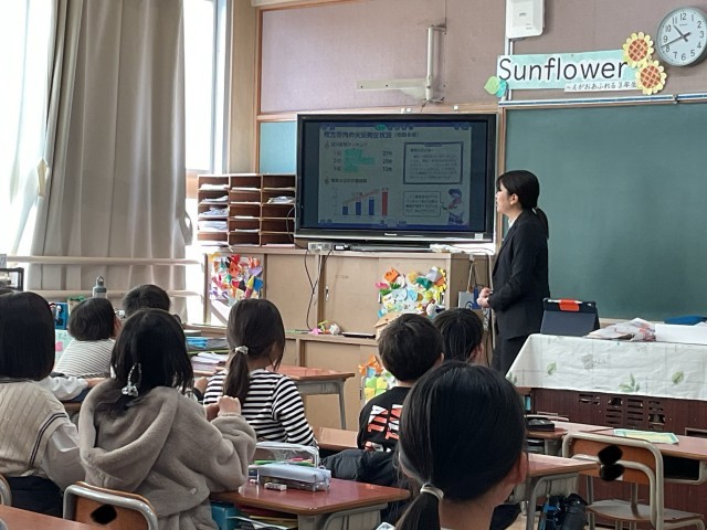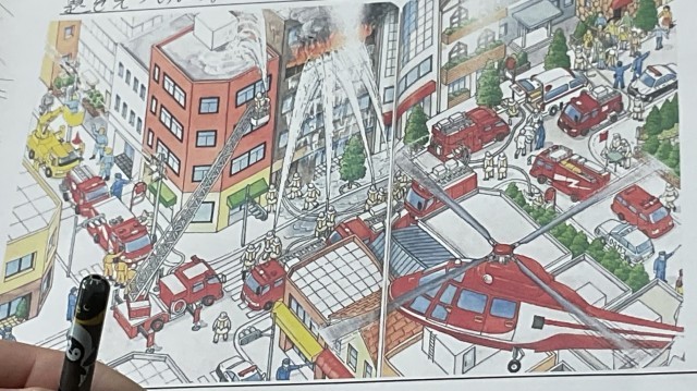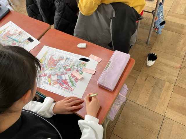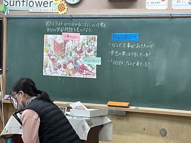 1月29日。3年生の社会科では火災現場で働く人のことを考えました。イラストを見て様々な仕事をしている方々を見つけていました。
